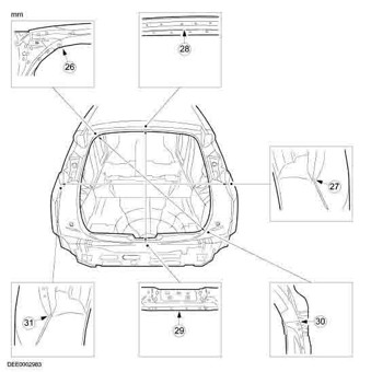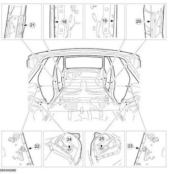 Контрольные кузовные размеры из заводского руководства по ремонту кузова FORD Focus RS 2002-2005, в том числе размеры проемов. Обратите внимание на миниатюры - изготовитель предоставил не очень полные данные по размерам.