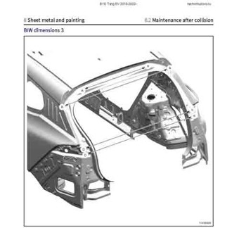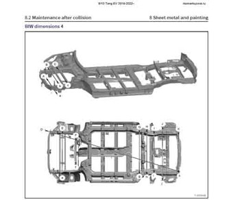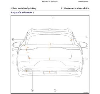 Контрольные размеры кузова для автомобилей BYD Tang EV 2018-2022-- из заводского руководства по ремонту кузова, в том числе размеры проемов кузова. Дополнительно приведены сведения о допустимых зазорах кузовных панелей.