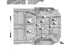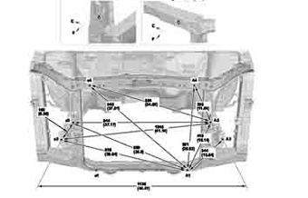 Контрольные кузовные размеры HONDA Passport 2019-2021-2025 из официального руководства по ремонту кузова. Содержат размеры верхней и нижней части кузова, в том числе размеры моторного отсека, диагональные размеры проемов кузова, размеры подрамников и контрольные точки для восстановления геометрии кузова. Даны значения допустимых зазоров кузовных панелей.