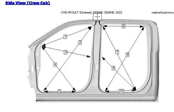 Контрольные кузовные размеры из официального руководства по ремонту кузова CHEVROLET Silverado 2500HD 3500HD 2019--, в том числе диагональные размеры проемов кузова. Обратите внимание: информация довольно скудна. В галерее представлены ВСЕ имеющиеся чертежи.