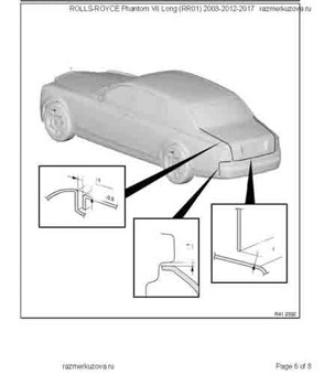 Контрольные кузовные размеры из официального руководства по ремонту кузова ROLLS-ROYCE Phantom VII Long (RR01) 2003-2012-2017. Дополнительно приведены величины зазоров кузовных панелей. Пояснения к чертежам автоматически переведены на русский язык.