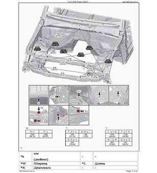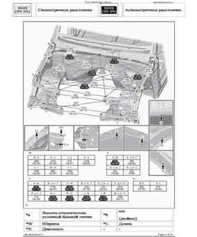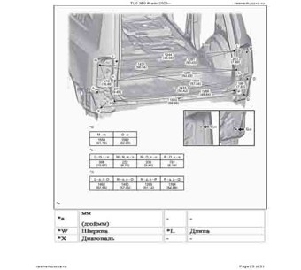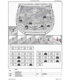 - Геометрические размеры кузова из официального руководства по ремонту TOYOTA Land Cruiser 250 Prado 2023--, как проекционные, так и непосредственного измерения, в том числе диагональные размеры проемов кузова и контрольные точки для восстановления геометрии кузова.