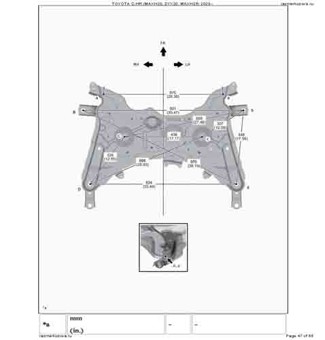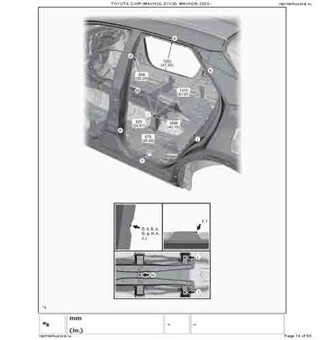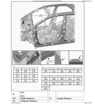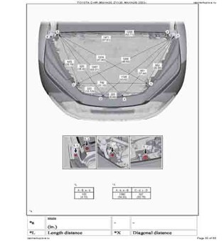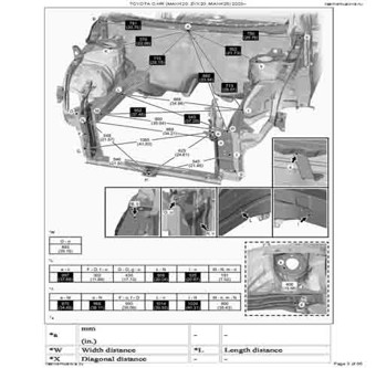 - Геометрические размеры кузова из официального руководства по ремонту TOYOTA C-HR (MAXH20, ZYX20, MAXH25) 2023--, как проекционные, так и непосредственного измерения, в том числе диагональные размеры проемов кузова и контрольные точки для восстановления геометрии. Рассмотрены модели с обычным ДВС, гибридным двигателем (HEV), подключаемым гибридным двигателем (PHEV), с полным приводом (AWD), с передним приводом (2WD), с панорамной крышей (Panoramic Moon Roof), со стандартной крышей (Standart Roof).