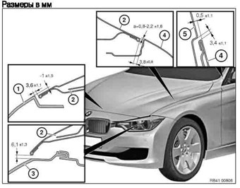 Контрольные кузовные размеры из официального руководства по ремонту кузова BMW 3 (F30) 2012-2015-2018. Дополнительно приведены величины зазоров кузовных панелей. Пояснения к чертежам автоматически переведены на русский язык. Обратите внимание: информация довольно скудна. В галерее представлены ВСЕ имеющиеся чертежи. Производитель предупреждает: "Все размеры используются только для проверки; точные размеры задаются стапелем."