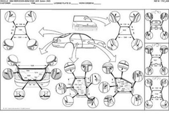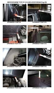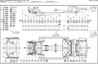 - Проекционные размеры с привязкой к стапелю. Дополнительно приведены цветные фотографии мест расположения контрольных точек на реальном автомобиле.