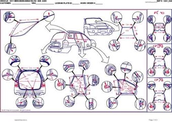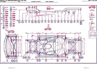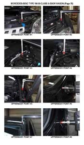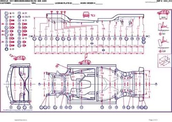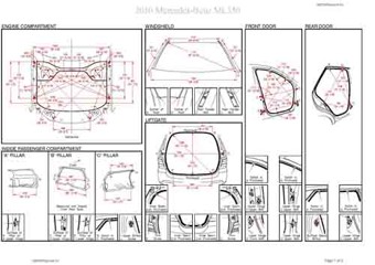 - Проекционные размеры с привязкой к стапелю. Дополнительно приведены цветные фотографии мест расположения контрольных точек на реальном автомобиле.