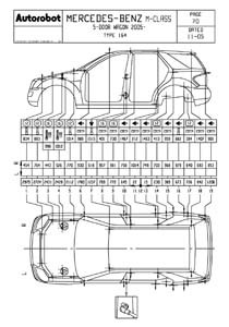 - Размеры кузова для автомобилей MERCEDES-BENZ M-Klasse (W164) 2005–2011, как проекционные, так и непосредственного измерения, в том числе диагональные размеры проемов кузова.