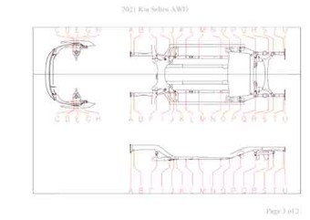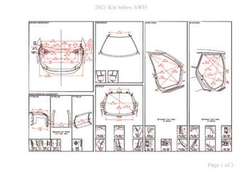 - Геометрические размеры кузова KIA Seltos 2019-, как проекционные, так и непосредственного измерения, в том числе диагональные размеры проемов кузова и контрольные точки для восстановления геометрии кузова.