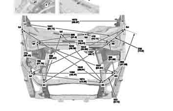 Контрольные кузовные размеры HONDA Pilot 2015-2018-2022 из официального руководства по ремонту кузова. Содержат размеры верхней и нижней части кузова, в том числе размеры моторного отсека, диагональные размеры проемов кузова, размеры подрамников и контрольные точки для восстановления геометрии кузова. Даны значения допустимых зазоров кузовных панелей.