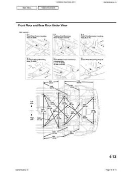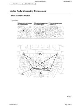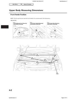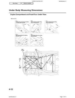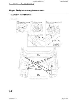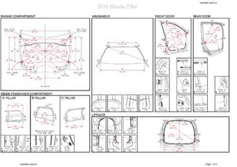 Контрольные кузовные размеры HONDA Pilot 2008-2011 из официального руководства по ремонту кузова. Содержат размеры верхней и нижней части кузова, в том числе размеры моторного отсека, диагональные размеры проемов кузова, размеры подрамников и контрольные точки для восстановления геометрии кузова. Даны значения допустимых зазоров кузовных панелей.