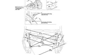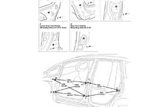 Контрольные кузовные размеры HONDA Fit 2008-2013 из официального руководства по ремонту кузова. Содержат размеры верхней и нижней части кузова, в том числе размеры моторного отсека, диагональные размеры проемов кузова, размеры подрамников и контрольные точки для восстановления геометрии кузова. Даны значения допустимых зазоров кузовных панелей.