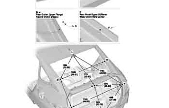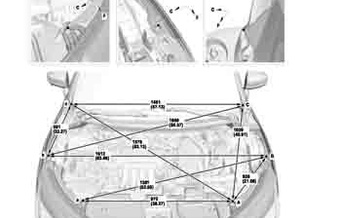 Контрольные кузовные размеры HONDA Clarity Plug-In Hybrid 2017-2021 из официального руководства по ремонту кузова. Содержат размеры верхней и нижней части кузова, в том числе размеры моторного отсека, диагональные размеры проемов кузова, размеры подрамников и контрольные точки для восстановления геометрии кузова. Даны значения допустимых зазоров кузовных панелей.