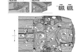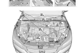 Контрольные кузовные размеры HONDA Accord IX (CR2, CR3) 2012-2016-2017 из официального руководства по ремонту кузова. Содержат размеры верхней и нижней части кузова, в том числе размеры моторного отсека, диагональные размеры проемов кузова, размеры подрамников и контрольные точки для восстановления геометрии кузова. Даны значения допустимых зазоров кузовных панелей.
