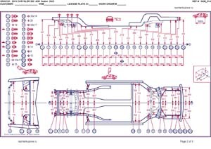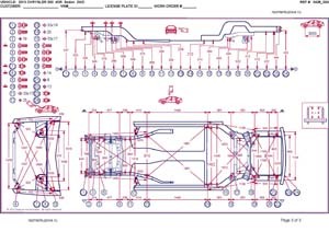 -Геометрические размеры, как проекционные, так и непосредственного измерения, в том числе диагональные размеры проемов кузова и контрольные точки для восстановления геометрии.