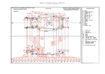 - Геометрические размеры кузова MAZDA MX-5 (ND) Miata 2015--, как проекционные, так и непосредственного измерения, в том числе диагональные размеры проемов кузова и контрольные точки для восстановления геометрии кузова.
