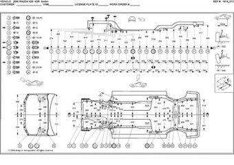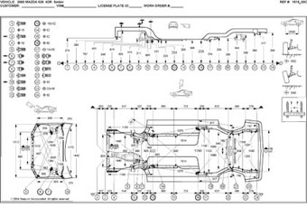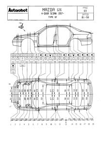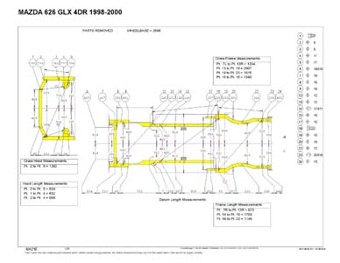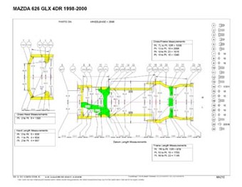 - Геометрические размеры, как проекционные, так и непосредственного измерения, в том числе диагональные размеры проемов кузова и контрольные точки для восстановления геометрии кузова Mazda 626.