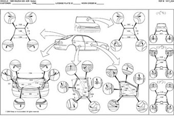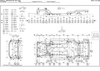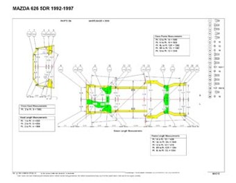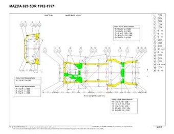 - Геометрические размеры, как проекционные, так и непосредственного измерения, в том числе диагональные размеры проемов кузова и контрольные точки для восстановления геометрии кузова Mazda 626.