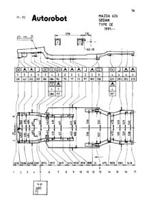 - Проекционные геометрические размеры кузова Mazda626 с привязкой к стапелю.