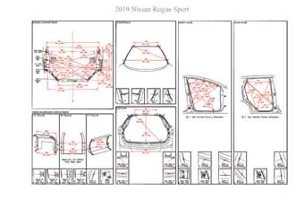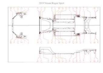 - Геометрические размеры кузова NISSAN Rogue Sport 2017-2019, как проекционные, так и непосредственного измерения, в том числе диагональные размеры проемов кузова и контрольные точки для восстановления геометрии кузова.