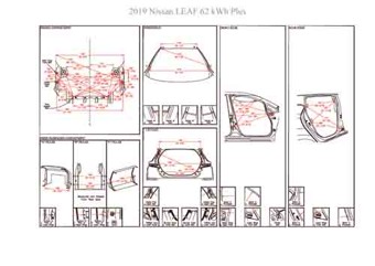 - Геометрические размеры кузова NISSAN Leaf (ZE1) 2018-2024, как проекционные, так и непосредственного измерения, в том числе диагональные размеры проемов кузова и контрольные точки для восстановления геометрии кузова.