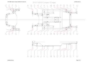 - Геометрические размеры кузова MINI Cooper Coupe (R58) 2011-2015, как проекционные, так и непосредственного измерения, в том числе диагональные размеры проемов кузова и контрольные точки для восстановления геометрии кузова.