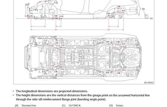 - Геометрические размеры кузова SUBARU Outback 2014-2018-2020 для автомобилей североамериканского рынка, как проекционные, так и непосредственного измерения, в том числе диагональные размеры проемов кузова и контрольные точки для восстановления геометрии кузова.