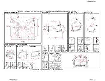 - Геометрические размеры кузова CHEVROLET Suburban 1500, 2500 2000-2006, как проекционные, так и непосредственного измерения, в том числе диагональные размеры проемов кузова и контрольные точки для восстановления геометрии кузова.