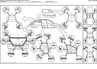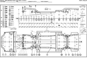 - Проекционные геометрические размеры кузова с привязкой к стапелю. Дополнительно приведены цветные фотографии мест расположения контрольных точек на реальном автомобиле.