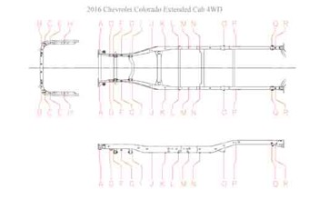 - Геометрические размеры кузова CHEVROLET Colorado 2012-2022, как проекционные, так и непосредственного измерения, в том числе диагональные размеры проемов кузова и контрольные точки для восстановления геометрии кузова.