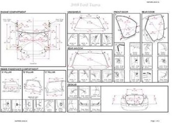- Геометрические размеры кузова FORD Taurus 2007-2009, как проекционные, так и непосредственного измерения, в том числе диагональные размеры проемов кузова и контрольные точки для восстановления геометрии кузова.