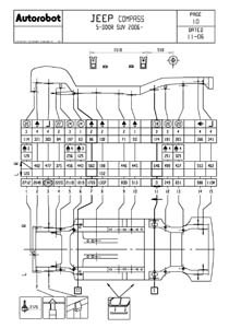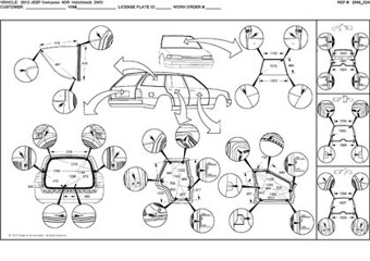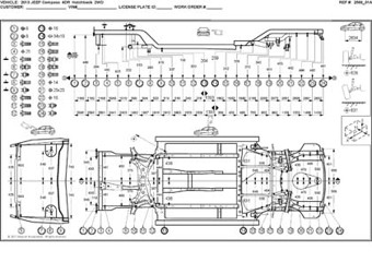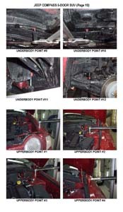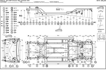- Проекционные геометрические размеры кузова с привязкой к стапелю. Дополнительно приведены цветные фотографии мест расположения контрольных точек JEEP Compass на реальном автомобиле.
