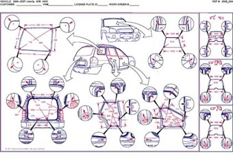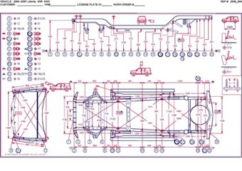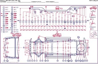 - Проекционные геометрические размеры кузова с привязкой к стапелю. Дополнительно приведены цветные фотографии мест расположения контрольных точек JEEP Cherokee/Liberty на реальном автомобиле.
