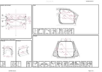 - Геометрические размеры кузова FIAT 500 2007-2009, как проекционные, так и непосредственного измерения, в том числе диагональные размеры проемов кузова и контрольные точки для восстановления геометрии кузова.