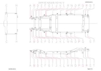 - Геометрические размеры кузова HUMMER H2 SUV 2002-2007-2009, как проекционные, так и непосредственного измерения, в том числе диагональные размеры проемов кузова и контрольные точки для восстановления геометрии кузова.