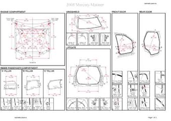 - Геометрические размеры кузова MERCURY Mariner 2007-2011, как проекционные, так и непосредственного измерения, в том числе диагональные размеры проемов кузова и контрольные точки для восстановления геометрии кузова.