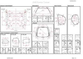 - Геометрические размеры кузова PONTIAC Torrent 2005–2009, как проекционные, так и непосредственного измерения, в том числе диагональные размеры проемов кузова и контрольные точки для восстановления геометрии кузова.