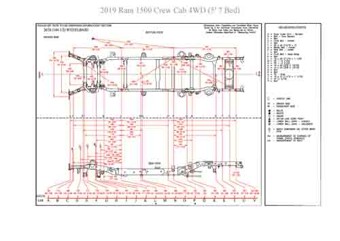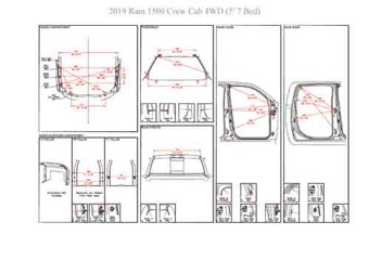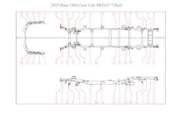 - Геометрические размеры кузова RAM 1500 (DT) 2018--, как проекционные, так и непосредственного измерения, в том числе диагональные размеры проемов кузова и контрольные точки для восстановления геометрии кузова.