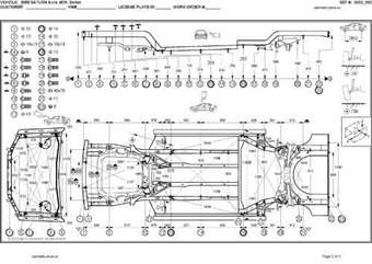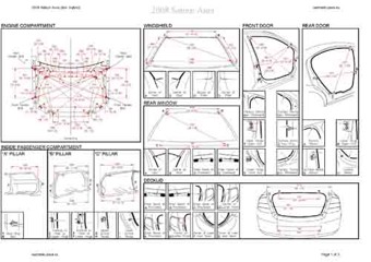 - Геометрические размеры кузова SATURN Aura 2006-2009, как проекционные, так и непосредственного измерения, в том числе диагональные размеры проемов кузова и контрольные точки для восстановления геометрии кузова.