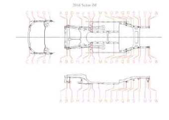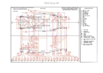 - Геометрические размеры кузова SCION iM 2015-2016, как проекционные, так и непосредственного измерения, в том числе диагональные размеры проемов кузова и контрольные точки для восстановления геометрии кузова.