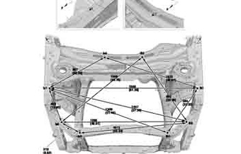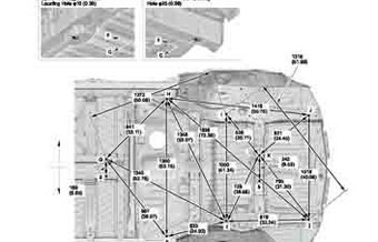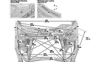 Контрольные кузовные размеры ACURA MDX 2013–2016-2020 из официального руководства по ремонту кузова. Содержат размеры верхней и нижней части кузова, в том числе размеры моторного отсека, диагональные размеры проемов кузова, размеры подрамников и контрольные точки для восстановления геометрии кузова. Даны значения допустимых зазоров кузовных панелей.